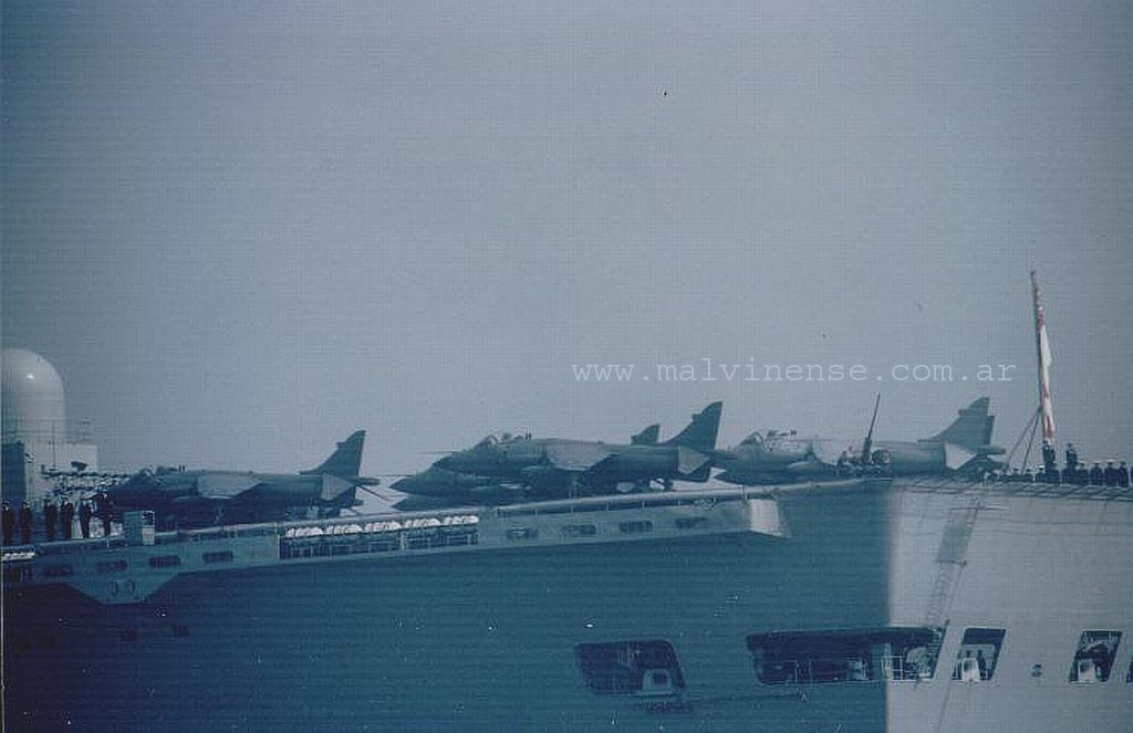 Armamento: 2 disparadores Sea Dart SAM; 8 Sea Harriers (a las islas fue con 9); 15 Sea king