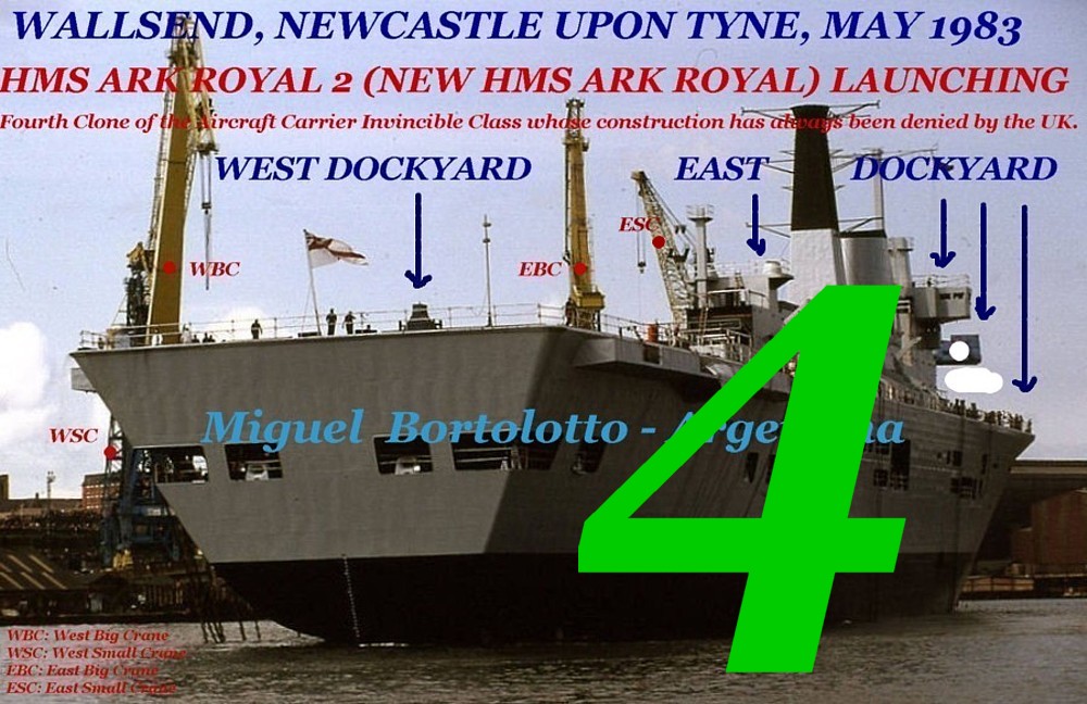 4.- Construcción del "HMS Ark Royal 2", que reemplazó al Ark Royal original Breve resumen del ocultamiento británico El día 30 de mayo de 1982, el portaaviones Invincible sufre el impacto de un misil Exocet de la Aviación Naval, del que son testigos los dos pilotos de la Fuerza Aérea que logran arrojar sus bombas contra el buque y regresar con vida al continente. El portaaviones, según versión oficial, contenía casi el 40% del material nuclear que Inglaterra llevó a Malvinas. De hundirse esa misma noche, dicha carga pudo no haberse recuperado. El mapa petrolero británico publicado hace algunos años por este medio, demuestra que existe un blanco hundido que no corresponde a ningún buque oficialmente declarado, en coordenadas cercanas donde fue el ataque el día 30 de mayo. Ello indica que entre el ataque y el hundimiento no pasó más de un día o dos. El 31/05 Argentina, mediante el Comunicado Oficial 112, anuncia el ataque al portaaviones. El día 01/06 en el Comunicado 118, se anuncia que Gran Bretaña reconoce el ataque al portaaviones Invincible. Al día siguiente, Gran Bretaña cambia su versión, anunciando que en realidad, se había atacado al hundido Atl. Conveyor (el buque fue atacado el 25/05 y hundido el 29). Luego, el día 3, al desmentir la versión anterior, informa que el buque atacado no fue el Atlantic Conveyor, sino la Avenger y que esta fragata ha derribado a los aviones argentinos por el sistema de Sea Dart (sistema que dicho buque no poseía). Más tarde, en los libros oficiales británicos cambian la versión del Sea Dart por la del cañón de 4,5 pulgadas con la que además, se derribó al misil Exocet. Finalmente la versión oficial británica queda construida de la siguiente manera: