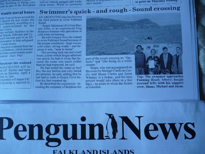 Diario de la travesía de cruzar a nado el Estrecho de San Carlos. Martes 31 de marzo: Me pasaron a buscar a las 8.30 y me llevaron en camioneta desde Puerto Argentino a San Carlos que son 80 km pero como no hay caminos asfaltados y son todos de ripio le pusimos 2 hrs. El famoso puerto de San Carlos tiene dos casas con una sola familia que es la propietaria del barco que me llevó. Bajamos, tomamos té, preparé el caldo caliente y partimos. Nos llevó una hora recorrer toda la bahía para desembocar en el estrecho, el camino y el paisaje es alucinante y no te hace presagiar lo que viene adelante; estuvimos todo el recorrido rodeados de unos delfines del antártico que son como los que conocemos pero negros y con el lomo blanco como si fueran pichones de orcas. Cuando llegamos a la desembocadura de la bahía, no tienen una idea de lo que viene: el cielo y el infierno (medio que ya estaba acostumbrado ya que mi vida es así, y te da miedo el solo pensar que allí hubo argentinos sin preparación ni recursos suficientes). Entra la corriente desde el norte a todo lo que da y se choca con los vientos que generalmente soplan del sudoeste; es lo más impresionante que ví en mi vida, les juro que es lo que siempre quise ver y en donde siempre quise nadar: en el medio del Atlántico con olas de 4 metros de altura (toqué el cielo con las manos). El barco tardó una hora en cruzar el estrecho porque debe hacerlo de costado para no hundirse ya que el movimiento hace que se escoree hasta 35° para un lado y para el otro. Estuvimos una hora navegando de esa forma y vomité dos veces ya que imposible de aguantar si no sos un marinero acostumbrado. El movimiento es impresionante y les juro que dudé en tirarme al agua ya que no solo tenía que luchar contra el frío si no que debía hacerlo con olas peores de las que esperaba. Cuando llegamos a Jersey point, el capitán me dijo que esperáramos media hora para ver si calmaba un poco el viento ya que a esa hora siempre lo hace. Comencé a prepararme (geles, virgen del Nahuel, lanolina en los piés, reloj, llevar el caldo y los geles al otra bote de goma) y listo. Del barco me pasé al bote, toqué el agua con los piés (estaba igual que el día anterior: helada) y adelante. Cuando comencé a nadar sentí como si me estuvieran clavando alfileres constantemente en el cuello y en la nuca, los piés no los sentí jamás; le dí a todo ritmo y pensaba que con ello se me iba a ir pasando el frío pero... eso nunca sucedió. Es la primera vez que después de nadar hora y media en agua fría, siento los mismos síntomas desde el primer minuto hasta el último. En cuanto a sensaciones, es la primera vez que supero algo como la montaña rusa . Todo el tiempo una sensación de uuaaauuuu!!!!!!; olas de 3 o 4 metros y yo para arriba y para abajo, de repente viendo la costa y luego hundido en una masa de agua, el océano completamente verde jade transparente, un verde tan profundo que podías sentir que ese color era solamente alcanzable en ese grado de frialdad del agua, y el viento de 40 km, y el gomón que por el oleaje a veces estaba a un metro y a veces a cinco.