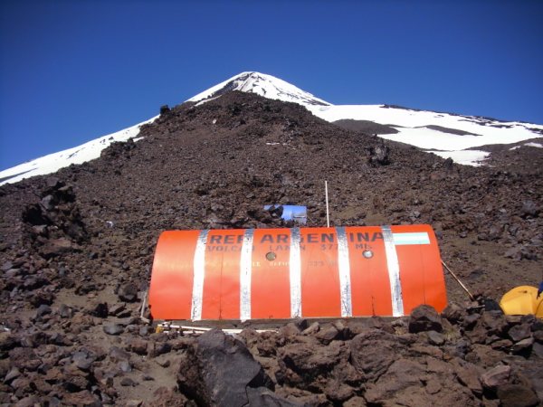 Llegado el día tan esperado, comenzamos el ascenso a las 12 del mediodía, cargando mochilas, equipos para el hielo, agua y alimentos. Paso a paso nos fuimos acercando a La Espina de Pescado, sendero que tiene una inclinación de 45º y que consume sudor y lagrimas. El sacrificio nos dejo a las 18hs en el primer refugio que pertenece al RIM 26 situado a 2200m de altura, donde se debe hacer noche para descansar y reponer fuerzas.