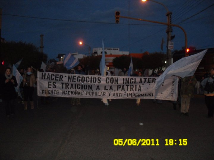 Unos treinta patriotas que viven en la Ciudad de Comodoro Rivadavia se trasladaron esta tarde a Puerto Deseado encabezados por Juan Toni López. Al llegar, otro grupo compuesto por decenas de ciudadanos de Deseado junto a la prensa local, los esperaban con globos y banderas argentinas. Pese al frío, que superaba los tres grados bajo cero, la ciudadanía de Deseado les dio la bienvenida a quienes han dejado a sus familias y labores cotidianas para expresar su rechazo a los barcos ingleses contratados por REPSOL. Más tarde se quemó una réplica de una plataforma petrolera británica, como ya es habitual en cada concentración que rechaza la presencia de barcos ingleses en las aguas del Mar Argentino. Se espera la llegada de los barcos ingleses al puerto local, que vienen desde Comodoro Rivadavia, donde recibieron el repudio del Concejo Deliberante local.