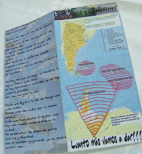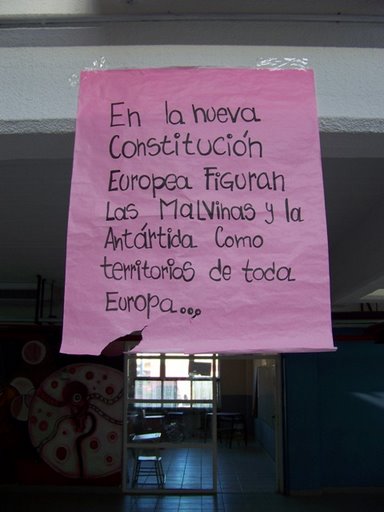 El famoso texto que traspasó las fronteras, que luego fue desvirtuado y que ha provocado un gran dolor de cabeza a Cancillería, sigue dando vueltas el mundo, y además, se reproduce en las escuelas, concientizando a los jóvenes... La Escuela Polivalente de Artes de Río Grande, realizó jornadas de concientización sobre Malvinas, Antártida y las 350 millas. Los gráficos, textos y pancartas, fueron realizadas teniendo en cuenta la información de nuestro diario virtual, El Malvinense