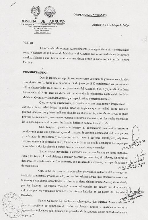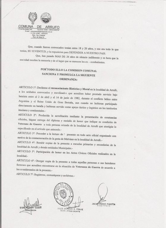La Comuna de Arrufo, provincia de Santa Fé, declaró el reconocimiento histórico y moral, a los exsoldados movilizados como Veteranos de Guerra, excombatientes de Malvinas. Medalla y diploma de honor...